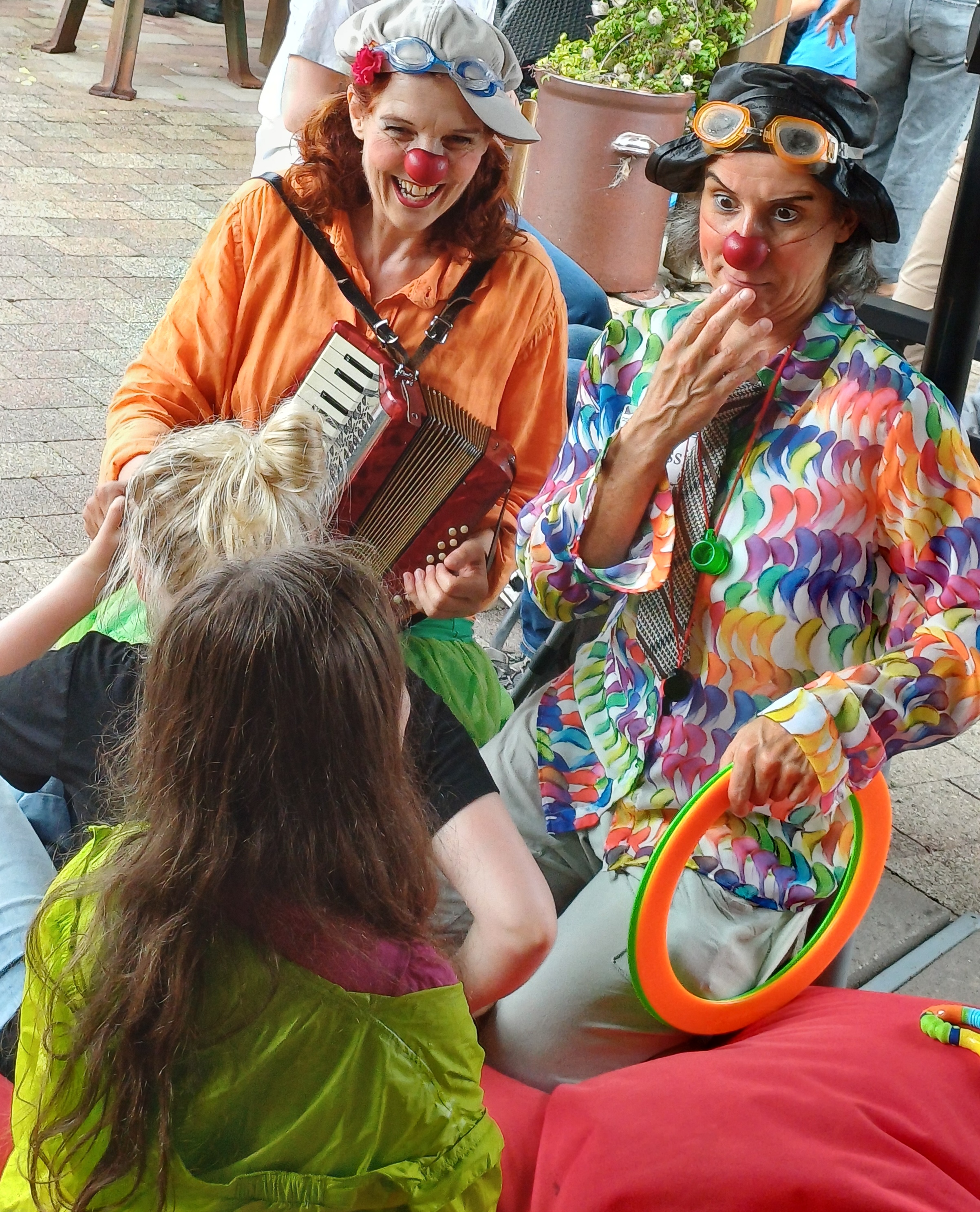 Überraschungen gab es immer wieder vom Wetter: Sonnenschein und Regen wechselten sich ab. Doch die größte Überraschung waren zwei unerwartete Gäste: Die Clowninnen Jossi und Cannelloni, die plötzlich mit ihren herrlich roten Clownnasen, bunt gekleidet und mit Schirm, Akkordeon und Koffer die Besucher*innen in Staunen versetzten. Sie waren bestens vorbereitet auf das Wetter, hatten neben Schirm auch Badeutensilien, Schwimmbrille und Schwimmflossen dabei. Mit diesen wurde von Jossi sogleich der Gartenteich erkundet, später gab es Wettrennen und „Wettschwimmen“ im Garten. Während der Regenschauer wurde unterm Sonnenschirm gemeinsam gespielt, Cannelloni stimmte mit ihrem Akkordeon witzige Lieder an, es wurde gemeinsam gesungen und natürlich ausgiebig gelacht.